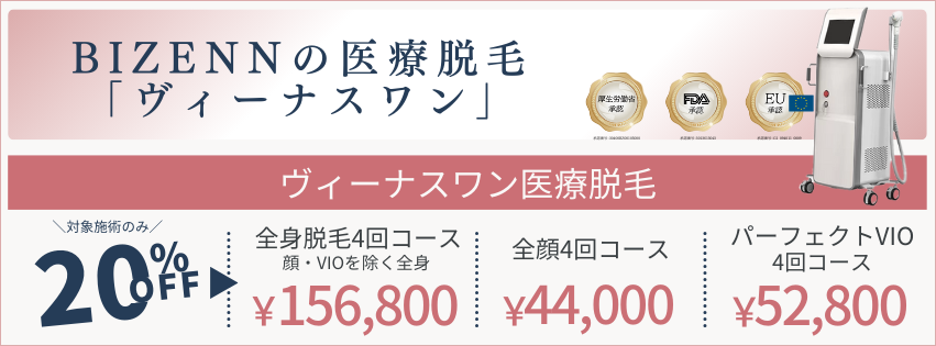 ヴィーナスワン医療脱毛メニュー(対象施術)が20%OFFで受けられます。