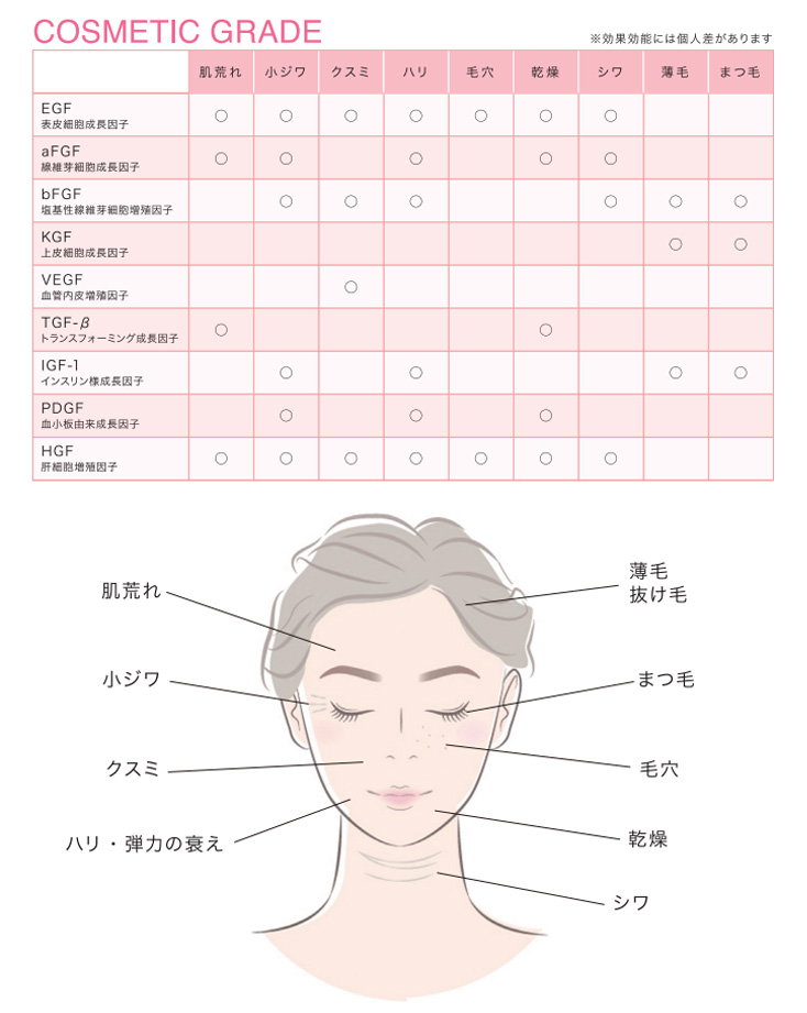 人間から抽出された幹細胞を培養する際に使用した培養液を遠心分離させ、滅菌処理を施した上澄み溶液に含まれる物質です。